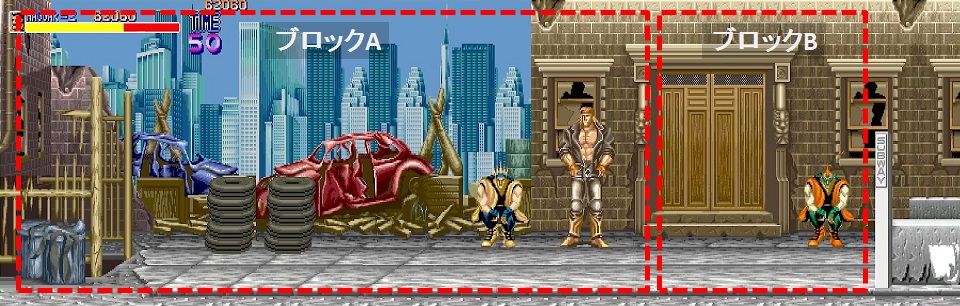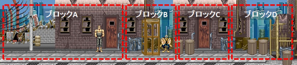 ブロックDはシーンの終端で、端にたどりつくと左手側の画面外からエネミーが登場。登場するエネミーはダグ、ブレッド、ナイフ使いのハリウッド、ガードを使いこなすアクセルの4体。