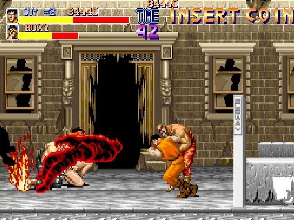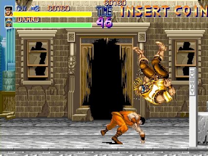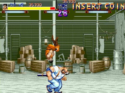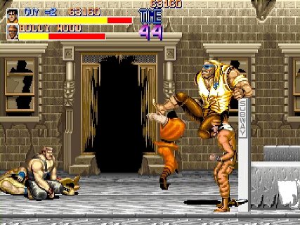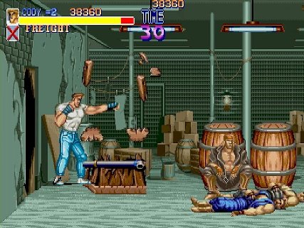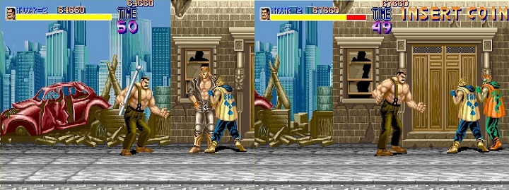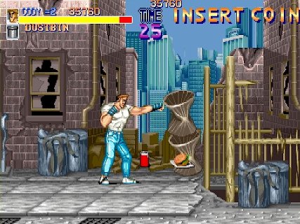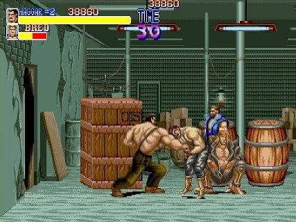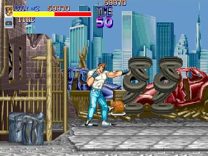 再びダムドが回転踵落としで復帰して混戦模様となったタイミングで、左画面端からハリウッド(赤)×2が加勢してくる。このエネミーの攻撃は火炎瓶なので注意が必要。同じ軸上に並んでいなければ火炎瓶の炎の対象にならない。また、殴りつけると火炎瓶を落として、その場に延焼して巻き込まれやすい。通常攻撃はやってこないので、掴みからの投げで遠くに放り投げて安全に始末しよう(投げで倒れた地点から火炎瓶が割れて発火する)。