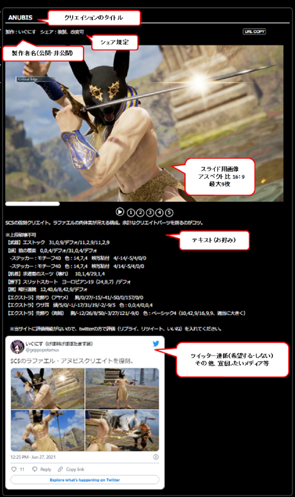 - ツイッター連係:当サイトには投稿されたクリエイションを評価する機能がありません。そこで、ツイートを埋め込みます(ツイート先でリプライやリツイート、いいね等の評価を受けられるようにします)。
