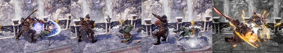 A/上)は、クイックハームフルスラッシャーの方がダメージが高く、ブラッドシュトロームの方がリーチが長いので、相手までの距離で使い分けるといい。