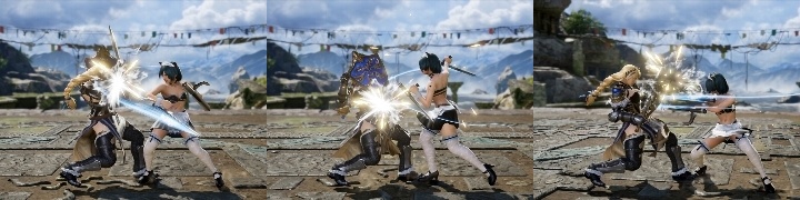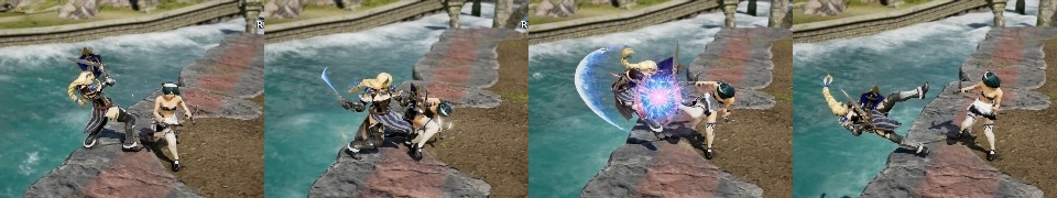 タリムがその場で構える。上中段の横斬りをかわして反撃できる。遠くで使われるときは付き合わないが大正解。