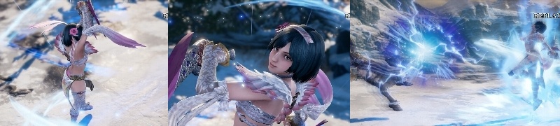 B(上):発生は遅いがジャンステ、ヒットで位置入れ替え、ガードで+2F&強制しゃがみという強力な技。正直これといった対策はないが、とはいえ逆択に使う技としては遅いので、暴れ潰しをきちんとしたい。ガード後慌てない。