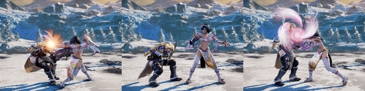 ターンAB~背向けはガードで-4F。ガード後背向けから攻め立てられる場合は、ガード後BBで概ねすべて割れるはず。背向けBを食らってしまうとスタンから高火力コンボを食らうので注意。