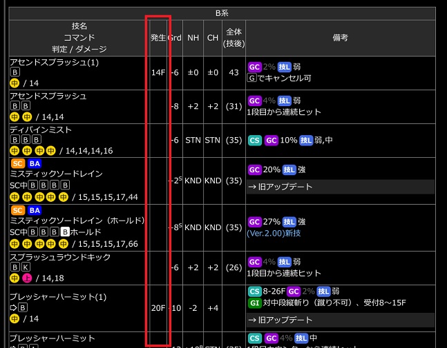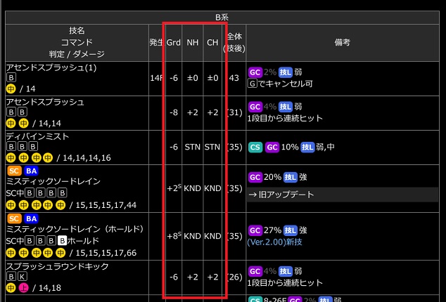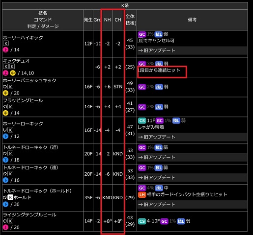 カウンターで効果の変わる技は、当サイトで公開している技表で調査済みなので、参照すれば確認が早い。列『NH』はノーマルヒット、列『CH』はカウンターヒットの略で、ノーマルヒットとカウンターヒットで記載が異なる技を探すとよい。また、カウンターヒットで連続ヒットとなる技についても備考欄にコメントしてある。