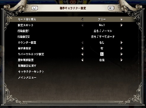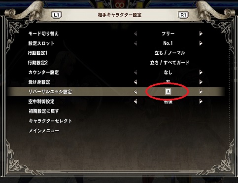 トレーニングモードが始まったら、OPTIONSボタンから設定メニューを呼び出し、『相手キャラクター設定』で次の設定を行う。