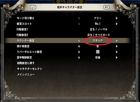 相手キャラクター設定で『カウンター設定』を『アタック』に設定しよう。これにより一部の技がヒットしたとき、ノーマルヒット(非カウンター)とは異なる結果になる。技によってノーマルヒットではつながらなかった連係技が連続ヒットになったり、スタンになったり、浮きになったり、浮きの高さが変わったりと、追加効果が発生する。
