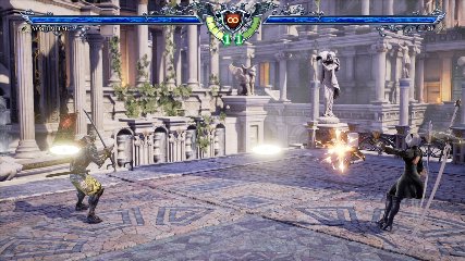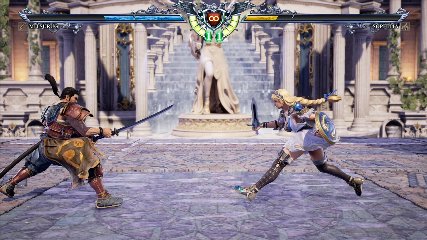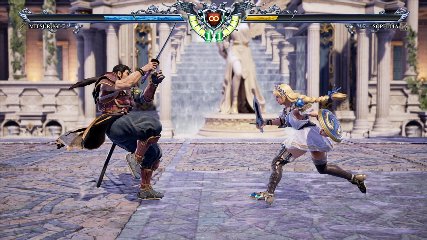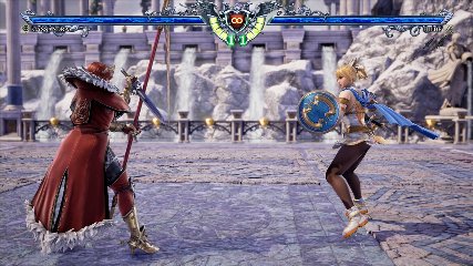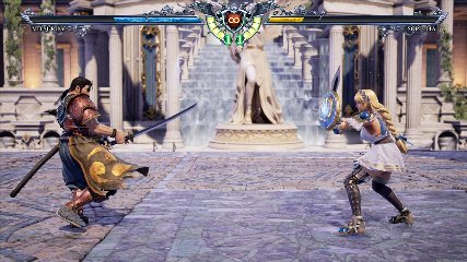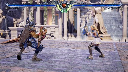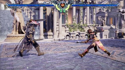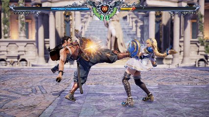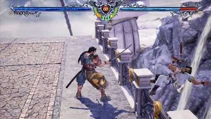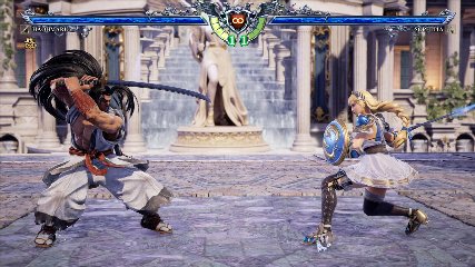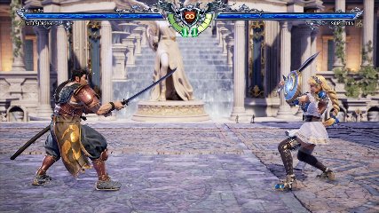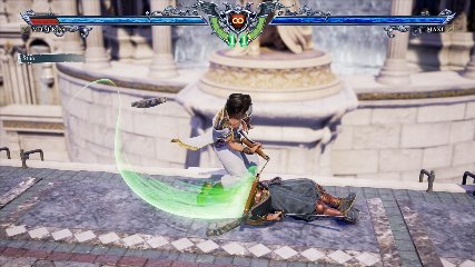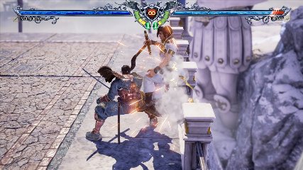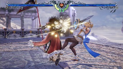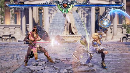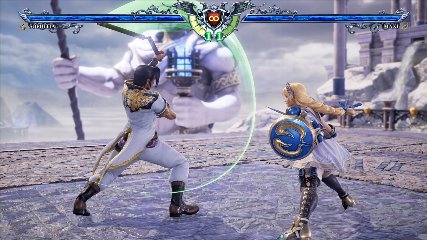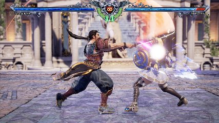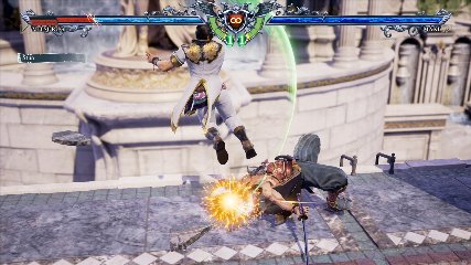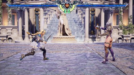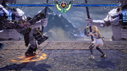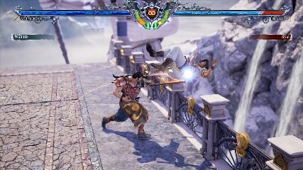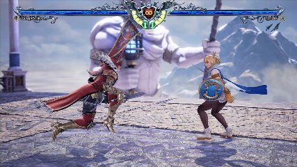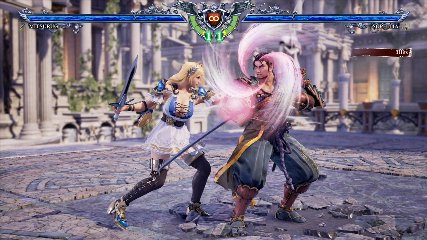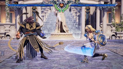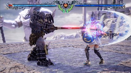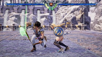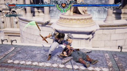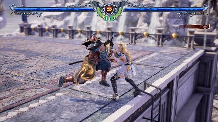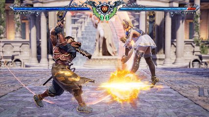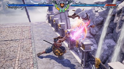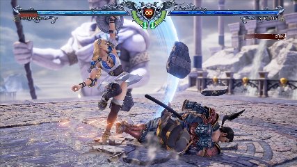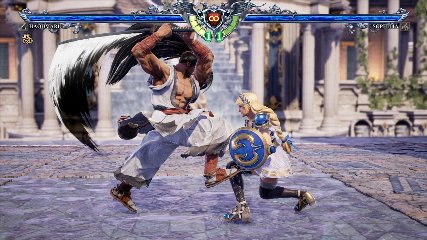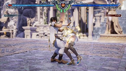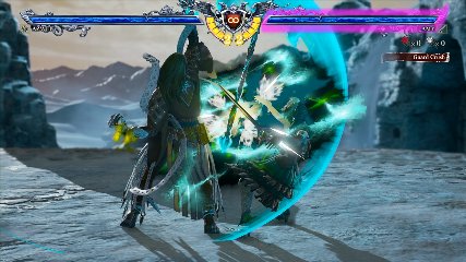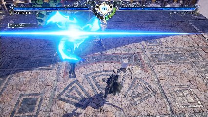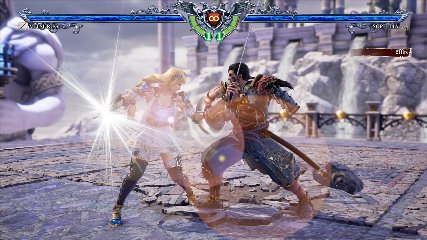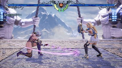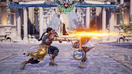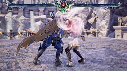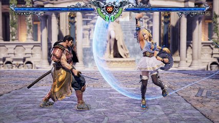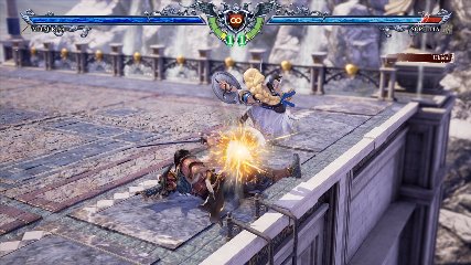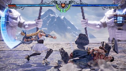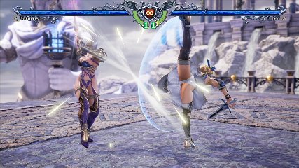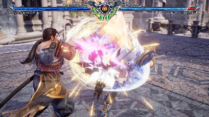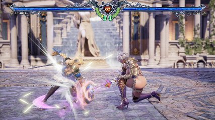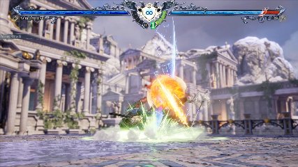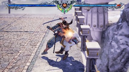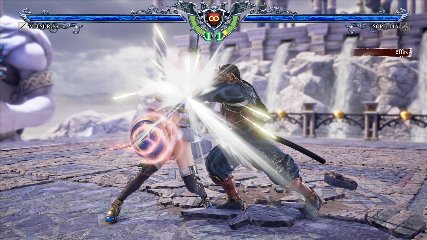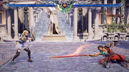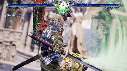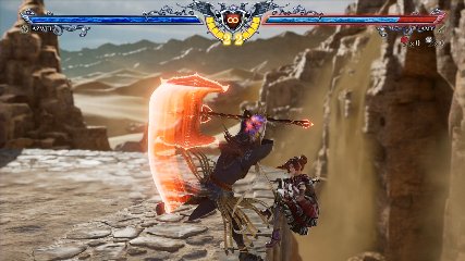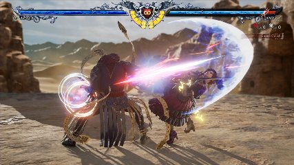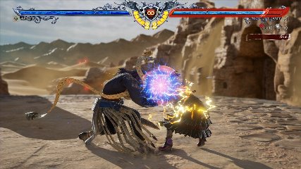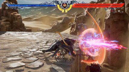 画像、遠距離の射撃攻撃に対して、ヨシミツのCE・霊火劫掠妖刃葬(A+B+K/中打投)でスカ。霊火劫掠妖刃葬は、発生は遅いが相手の頭上に瞬時にワープして攻撃するため、技後硬直の大きい相手空振りに対して、距離に関係なくスカを狙うことができる。