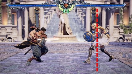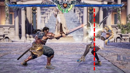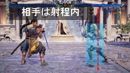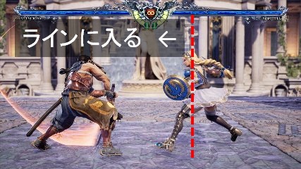 ■相手がラインに入るタイミングに合わせて『置く』『確定反撃はあるがリターンの高い』技を置く場合の考え方。ラインを越える瞬間は無防備になるので、その瞬間を狙う。相手がステップインガードを小刻みに使って間合いを変えてくる場合は、ギリギリ射程外に陣取り、相手が次で越えてきた瞬間を叩く。